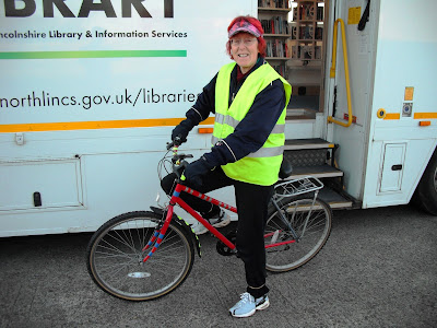 Did you know that one of our readers is an amazing cyclist, she has been all over Europe on her bike. Brenda writes a blog about her cycling trips, and her fabulous quilting. She set herself a goal of 4000 miles for 2016, and she has cracked it. While we have been walking, Brenda has been cycling, in all weathers, such is her dedication. Well done Brenda. You can read all about her adventures here.Today I thought about a cycling challenge for myself, perhaps I ought to get on my bike. So here I am having a practice ride. Pump up the tyres, put the front mudguard back on as it fell off ages ago, yellow vest, and elastic bands around my ankles to keep my jog bottoms from getting stuck in the chain. I called in at Paul's house to ask him the best place to buy a helmet, he laughed and said I look like a bin man. Cheek, just because he has got all the right gear. I stopped by the library van and I got Stan to take my photo. Do I really look like a bin man?